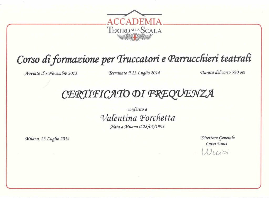 Proseguo il mio percorso formativo accedendo tramite selezione ad un corso di formazione per Truccatori e Parrucchieri Teatrali tenutosi presso l’Accademia Teatro alla Scala di Milano.